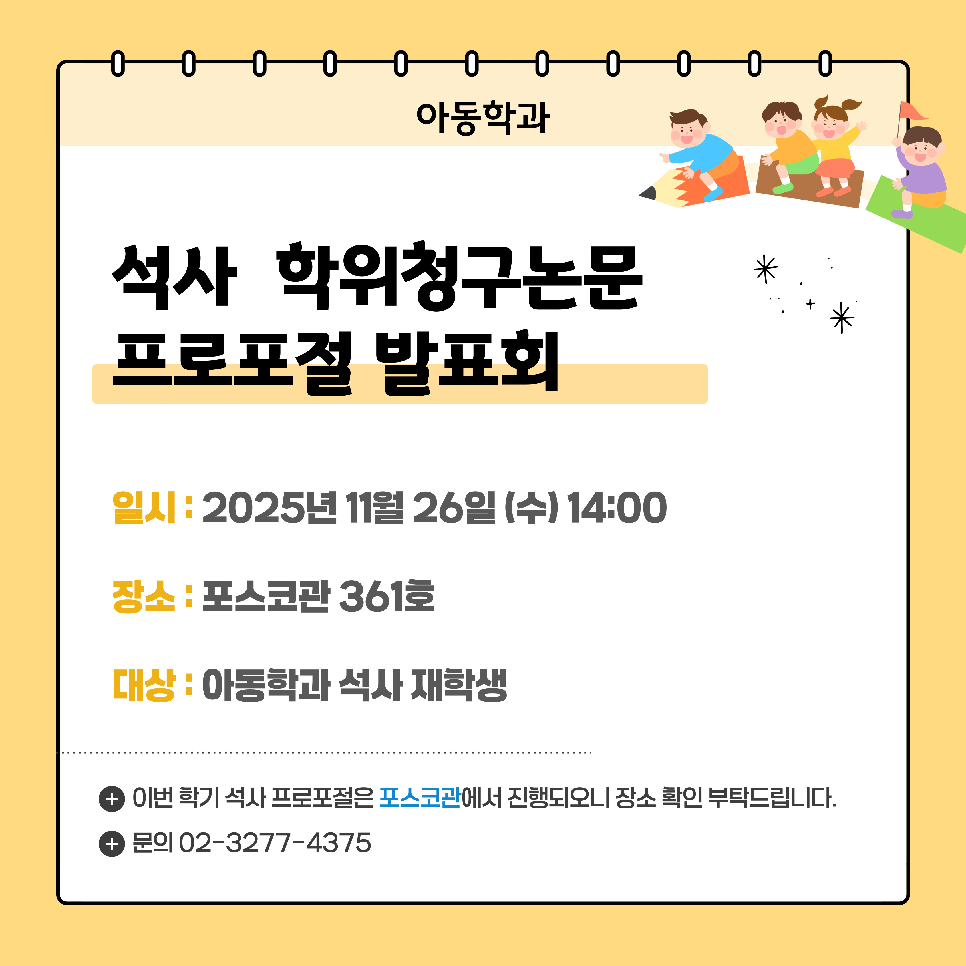 장소 : 포스코관 361호대상 : 아동학과 석사 재학생